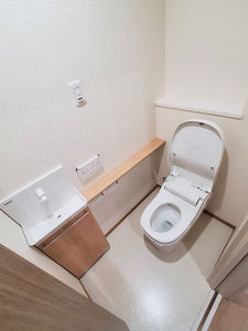 トイレも和便器をなくし、手洗いカウンター付きの広々とした空間になりました。スゴピカ素材でお掃除もラクラクです。電池で水を流せるので、いざという時も安心です。
