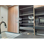 天井から床までの大容量カップボードでスッキリ収納。扉を閉めれば重厚な家具調が空間にマッチ。並ぶと狭くなりがちなシンクも三方向から使えます。