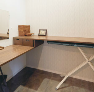 洗濯機横の家事室。洗濯物をたたむ際は立ちながら、メイクは座りながらできるように、高さ違いのカウンターを設置。
