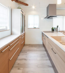 料理好きのN様ご一家。通路を広めに確保したので家族一緒に料理ができます。キッチン扉は天井梁と調和する木目調に。