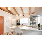 梁のある高い天井の魅力を際立たせる照明計画や白基調のコーディネイトで、より開放的で広々とした空間に。