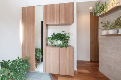 上がり框を斜めに配置することで、より広くなった玄関ホール。
