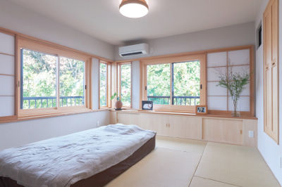 耐震フレームを入れてコーナー部分も開口とし、最大限に借景と自然光を取り込んだ和室。