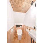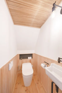 改装前の雰囲気を残したいと天井のよしずや扉を再利用したトイレ空間。機能的な設備を組み合わせてモダンな印象に。