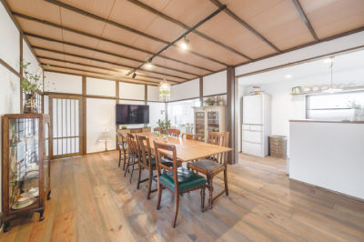 御祖父母様が遺してくれた家の古きよき風合いを大切にリフォームして受け継ぐことにしたS様。ご自慢のアンティーク家具が馴染む、和洋折衷空間に仕上げました。以前の家の雰囲気を残す古民家カフェ風のダイニングは、ご親族も集う特別な空間に。時の流れを感じる憩いの場となっています。
