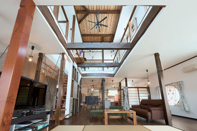 定年をきっかけにご実家を明るく広い空間にし、住みながらT様ご自身で手を加えられる部分を残してリフォーム。間仕切りを取り払い、2階の床も撤去して吹き抜けに。家の中心から陽光が降りそそぎ北側のキッチンも明るくなりました。筋交いは開放感生まれる鉄筋製に。DIYで自由な空間づくりを楽しめます。