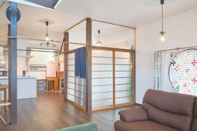 定年をきっかけにご実家を明るく広い空間にし、住みながらT様ご自身で手を加えられる部分を残してリフォーム。間仕切りを取り払い、2階の床も撤去して吹き抜けに。家の中心から陽光が降りそそぎ北側のキッチンも明るくなりました。筋交いは開放感生まれる鉄筋製に。DIYで自由な空間づくりを楽しめます。