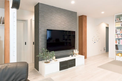 テレビを設置した壁の裏側に、書類や小物を収納できる棚を造作したことで、リビングをすっきり保てます。