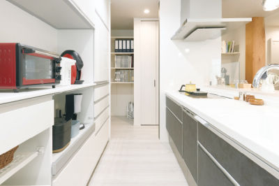 家事動線にこだわり、回遊できるアイランドキッチンに。大型のカップボードには調理家電やゴミ箱をまとめて収納できます。
