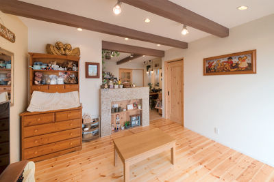 床・建具・棚板は数年後の風合いの変化が楽しみなパイン材。天井の化粧梁は色の濃いオークカラーで空間を引き締めました。