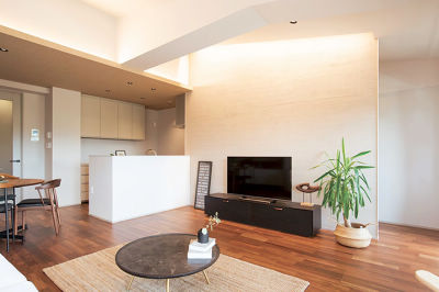 ご夫婦がそれぞれ心地よい場所でくつろぎながら会話も楽しめる大空間LDK。テレビ背面の壁は左官仕上げとし、光の加減で表情豊かに。