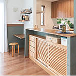 対面キッチンの前に奥行きのあるカウンターを造作し、下に収納家具を収めました。その横はレンジフード裏を活用し、カウンターを取り付けて書斎スペースに。