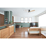 木のぬくもりを感じる住まいにしたいと、リビング・ダイニングに深みのあるグリーンの腰壁を設置。木目調のインテリアでコーディネイトして、落ち着いた雰囲気の空間に一新しました。