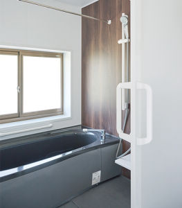 落ち着いたカラーの高級感のある浴室。窓は複層ガラスを採用。寒い冬でもあたたかく。