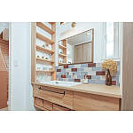 玄関からアクセスしやすいオープンな洗面室。ランドリーとは間仕切って、ネイルルームのお客様も使いやすく。