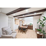 構造上見えてしまう梁を化粧し、デザインとして活かすことに。横長の高所窓はからの光が優しくリビングダイニングを照らします。洋室への扉は壁面に溶け込むグレーにし、自然とアクセントウォールに馴染むように。LDとKの間は梁で仕切って天井材を貼り分けているのがポイントです。