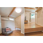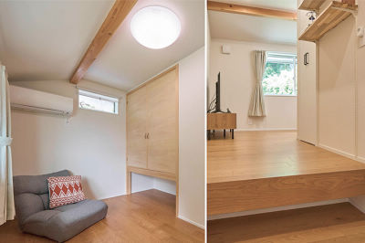 入り口を小上がりにしたご夫婦の寝室。布団収納の扉を木目調にして、和テイストの落ち着いた雰囲気に。