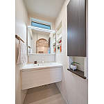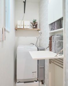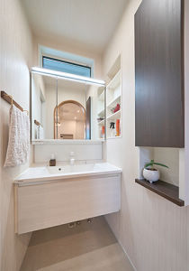 洗面室はコンパクトながら、物干しを設置し、タオルや小物をしまえる埋め込み収納をしつらえました。
