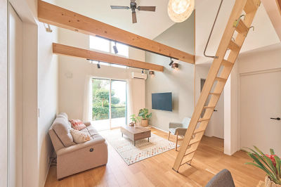 2本の梁が印象的なリビングは、吹き抜けがロフトとつながり開放感がアップ。大きな窓から景色が楽しめる家族の憩いの場に。