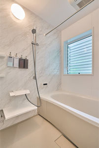 白を基調とした清潔感のあるシステムバスに。在来浴室の段差と寒さを解消して、お父様も大満足。