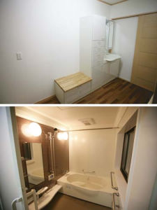 腰をかけて着脱衣ができるベンチチェスト。水周りもすべて床はフラット。