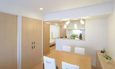 お身体の弱いお母様を見守りながら、家族3人で仲良く暮らそうと、中古マンションを購入してリフォームされたT様。まずは窓のないダイニングキッチンと和室2部屋という一昔前の間取りの大改造に取り組まれました。眺めのいいバルコニー側にLDKを移し、お一人お一人の個室も確保。家事をしながらお母様の様子が分かるようにと、お母様の個室はキッチンと横並びの位置に配置。引き戸を開ければLDKとひと続きの空間となります。