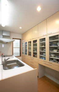 洗面・浴室とキッチンの位置を入れ替えて広いLDKに。対面型キッチンの後ろには大型のカップボードを設置し、収納も十分に確保しました。お祖母様との会話も増え安心感も増したそうです。