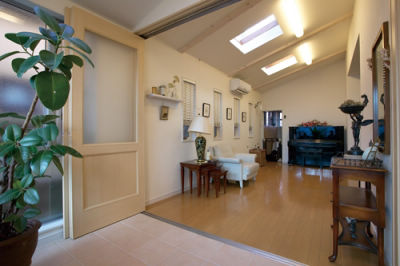 リビングとインナーテラスを増築して、家中どこからでも集えるように回遊性を持たせました。以前より広くなったリビングは、間仕切り開閉壁を開ければインナーテラスと一体に。テラス越しに庭ともつながります。天窓からも光がさんさんと降り注ぎ、横にも縦にも広がる空間は、まるで開放的なリゾートのよう。