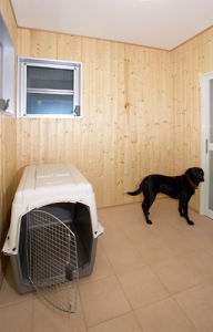 無垢材の壁や、床暖房付きのタイル床で、愛犬の健康と居心地に配慮したドッグルーム。