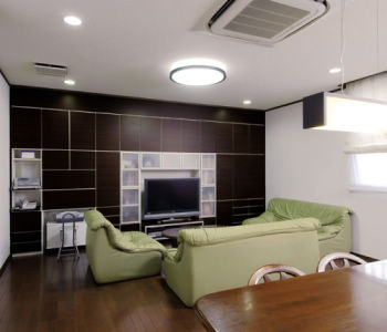 壁面収納を設置。二世帯7人の大家族がくつろぐLDKが、すっきりと片付きました。