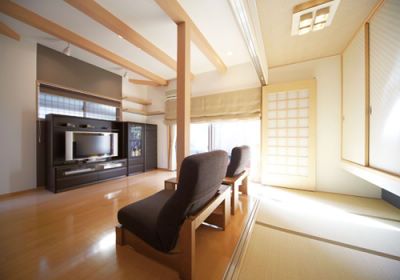 LDKの横には3畳の畳コーナーをつくりました。収納を備えつつ下部をオープンにし、間接照明を入れて広さを演出。間仕切り開閉壁を閉じれば、独立した空間としても使えます。「疲れたときにはゴロンと横になってリラックスできるし、洗濯物を畳むときも便利です」とご家族に大好評です。