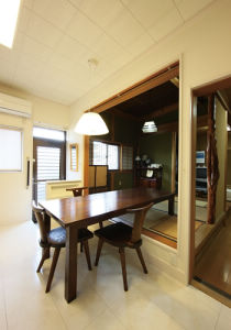 ダイニングが狭くて、子供や孫たちが遊びに来ても一緒に食事をする場所がなかったと言われるT様。ダイニングと和室の間にあった壁を撤去し、一体で使える広々したダイニングキッチンに。床と畳という床高の異なる二つの空間を、その段差を利用して、キッチン側からは椅子、和室側からは床に座って使えるよう特注でテーブルを作りました。ロールスクリーンで2つの空間を仕切れるので、急な来客時にも安心。子供や孫が来たときには、ロールスクリーンを上げると6人がゆったり座れます。
