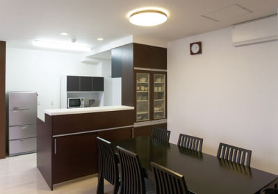 オフィスならではの柱がない広い空間を活かして、開放感のある広いリビングを実現。蛍光灯を外して天井をクロス張りにし、落ち着いた雰囲気の中にも現代的な感覚のある空間に。「小さな子供たちの気配をいつも身近に」という奥様のご要望から、キッチンは対面プランにして、リビングや和室まで見渡せるようにしました。