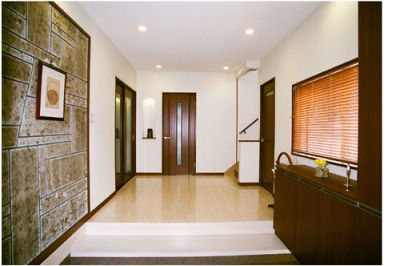 とても明るくなり、既存の大谷石の存在も蘇りました。玄関コンポリアの下にも「あかり」を・・・。 タイルをほんのり優しい色に変化させ玄関ホール全体を調和。