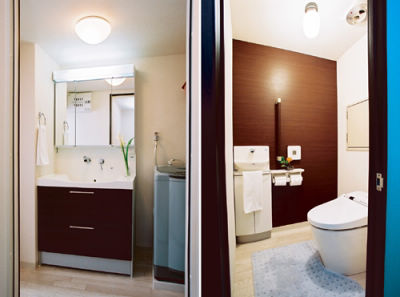 小さく区切られた水回りも色調をトータルコーディネートした事ですっきりとした印象に!