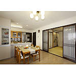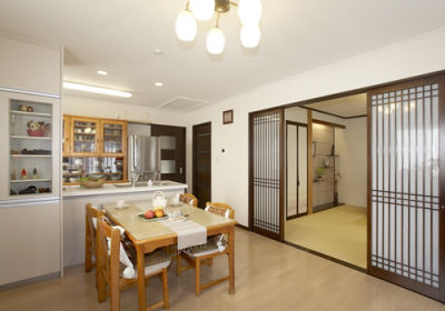 最初に耐震診断を実施し、補強計画を踏まえて間取りのプランニングに着手。北側に2尺、西側に5寸増築して、浴室と療養中のお母様が戻られたときの居室を確保しました。さらに、和室を1室撤去して、北側のキッチンを日当たりのいい南側へ移動。対面型のキッチンを設けて、ご夫婦のコミュニケーションを重視したスタイルに。和室はモダンなテイストにアレンジして、娘様ご一家が帰省した際に使えるよう計画しました。