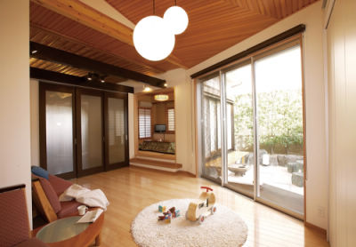 玄関を入るとすぐにキッチンが見えてしまうことも気にされていたため、玄関位置を変更。天井には既存家屋の天井材を再利用し、もともとの梁を残しながら新たに梁も加えて、迫力のあるダイナミックな空間に。建具のエクセルダーク柄に梁の色を合わせて塗装し、奥様がご希望されていた「大正ロマンのような雰囲気」を醸し出しています。正面の庭に面する大きな窓には断熱性能の高いペアガラスのサッシを採用して、美しい眺めと快適さを手に入れました。