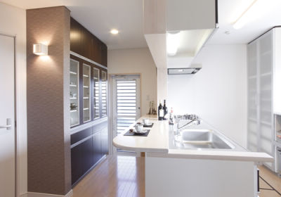 キッチンは広いものの収納が少なくモノが溢れていたS様邸。リフォームにあたっては、約2畳の大きな独立パントリーを設けました。中央に配したキッチンの背面には家電収納、正面にはカップボードを備え、さらに床下収納も設置。壁面はブラケット照明で光のアクセントをつくりました。ダークブラウンとホワイトを基調にした明るく落ち着いた、まるで奥様のラウンジのようなキッチンとなりました。