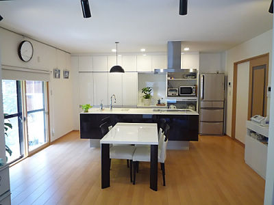料理教室や友人がよく集まると言う事だったので、アイランド型のキッチンを提案させて頂き、当初はお施主様が和室をそのまま残してといご要望だったのですが、思い切って和室もフロアーに変更させて頂きました。内装は白色にすることで明るく清潔感がでるようにしました。