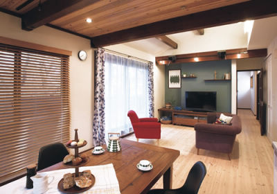 お子様の誕生をきっかけに、ご実家に戻ることにされたM様。2階の4人兄弟の個室を撤去し、LDKと寝室の大きく2つにゾーニング。さらに、北側を増築して1階と同位置に水廻りを配置。家事動線を短縮するとともに、両世帯が互いに気兼ねなく生活できるように配慮しました。「新しいものより古いもの、時間を経て素敵に変化していくものが好きですね」というお二人。好きな映画や雑誌を参考に、好みのテイストを共有しながら、丁寧に空間デザインや素材を決定していきました。リビングの天井は撤去して高い勾配天井とし、あらわしにした梁と金具にはアンティーク風の塗装を施しました。逆にダイニングは既存の天井高を活かしながら、唐松の天然木を張り、家族が落ち着いて団らんできる空間に。各部屋にはテーマカラーを設定し、ブルー・パープル・グリーンなどの北欧調のスモーキーな色が壁面を美しく飾っています。「好きなモノに囲まれて居心地がよく、家族をより近く感じられる住まいになりました」と話されています。