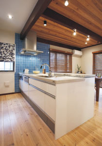 鮮やかな水色のタイルが、システムキッチンの色やデザインを空間に溶け込ませています