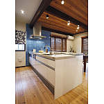 鮮やかな水色のタイルが、システムキッチンの色やデザインを空間に溶け込ませています