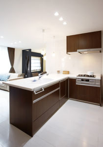 キッチンは「リビングステーション Sクラス」を採用。天然木に近い繊細でナチュラルな表情の扉柄が落ち着いた雰囲気を演出。L字型のレイアウトで効率的な家事動線を実現しました