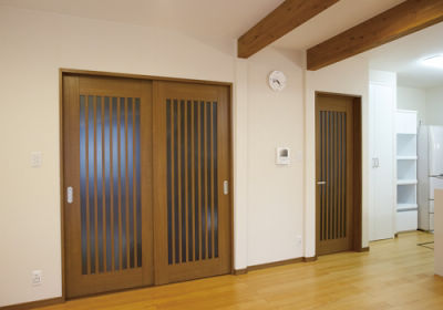 ぶつかってもガラスが割れにくいよう、縦格子入りの引戸とドアを採用