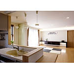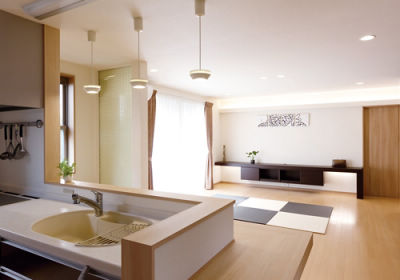 ご結婚を機に、ご実家を二人の新居にとリフォームされたA様。通風・採光を確保するため、LDKの間仕切り面積を減らし、透過性のある耐力壁に変更。共働きで一緒に料理することが多いことから、料理をしながら会話が楽しめるように、キッチンの周りにはL字型のテーブルを造作しました。間接照明が広がりを演出する明るい空間となったリビングには、ワイドなテレビボードやオープン棚を選び、若い二人の感性にマッチするスタイルに。休日には友達とのホームパーティが楽しめる素敵な新居となりました。