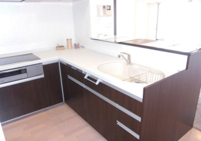 ご両親のお住まいの近くを条件に中古マンションを購入されたT様。古くても自分たちの思い通りの空間をつくりたいとリフォームされました。お料理しながら子供の姿が見えるようにと、対面式のキッチンに変更。さらに、隣接する和室を撤去し、広びろとしたリビングダイニングを実現しました。また、和室の押し入れを活かした大型収納や、キッチンのカウンター下にも収納を設置。収納力の高さが魅力です。キッチンとリビングに一体感が出るよう、ダークカラーで揃えることで、統一感のあるモダンな空間になりました。