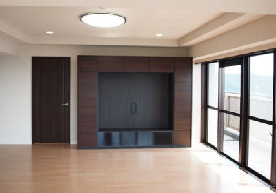 中古マンションを購入して、全面的にリフォームされたS様。明るい色の床材に変えてイメージを一新したリビングの壁面には、たっぷり収納できる「キュビオス」を設置。さらに、キッチンにも使い勝手の良い家電収納や食品庫などを設置しました。また、家電収納の背面にできた空間をリビング側に取り込み、飾り棚として有効活用。まるでオーダーマンションのような使いやすい住まいになりました。