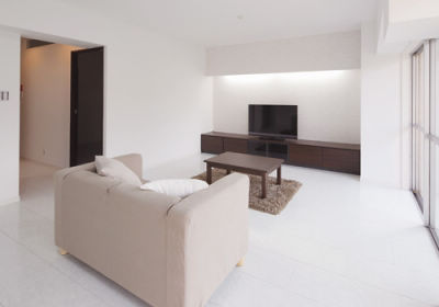 現代的でスタイリッシュな空間へ、中古マンションをリフォーム。コストを抑えるために水廻り設備の位置を動かさず、リビングダイニングを窓側へ移設して広い空間を確保。開放感を感じられる明るい空間になりました。圧迫感のないローボードの「キュビオス」と間接照明で、シアタールームの雰囲気を演出。大理石調の白い床にダークカラーの建具を配した、高級感のある上質な空間となりました。