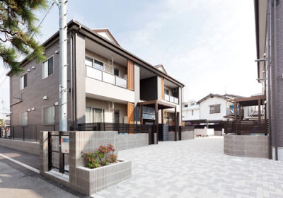 戦後に建てられた木造の借家を、地震に強いテクノストラクチャー工法を採用した集合住宅に建替え。バリアフリーや居住環境にも配慮することで長期優良住宅認定を受けました。特にコミュニティー形成に力を入れ、敷地内にはベンチや住民用の菜園も併設したコミュニティーゾーンを設置。さらに、1階住戸には、専用庭や専用スペースを確保し、まるで昔の縁側のように道行く人との会話が弾むような環境を目指しました。人の視線による防犯効果と共に、住民同士や周辺住民との間に「顔見知り」という親近感を育む役割も期待されています。