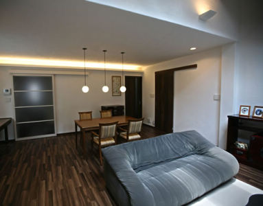 奥様の母親との同居のため増築、間取り変更をすることになりました。トップライトの効果で大きな収納家具も圧迫感なく、明るく開放的なリビングになりました。